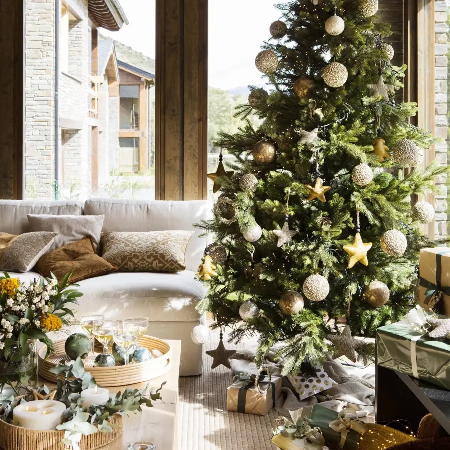 El árbol continúa como protagonista, adaptado a distintos estilos: muy decorado para un efecto abundante o delgado y discreto para espacios reducidos. La iluminación cálida, las velas LED, las guirnaldas suaves y los espejos adornados ayudan a crear atmósferas acogedoras y elegantes.